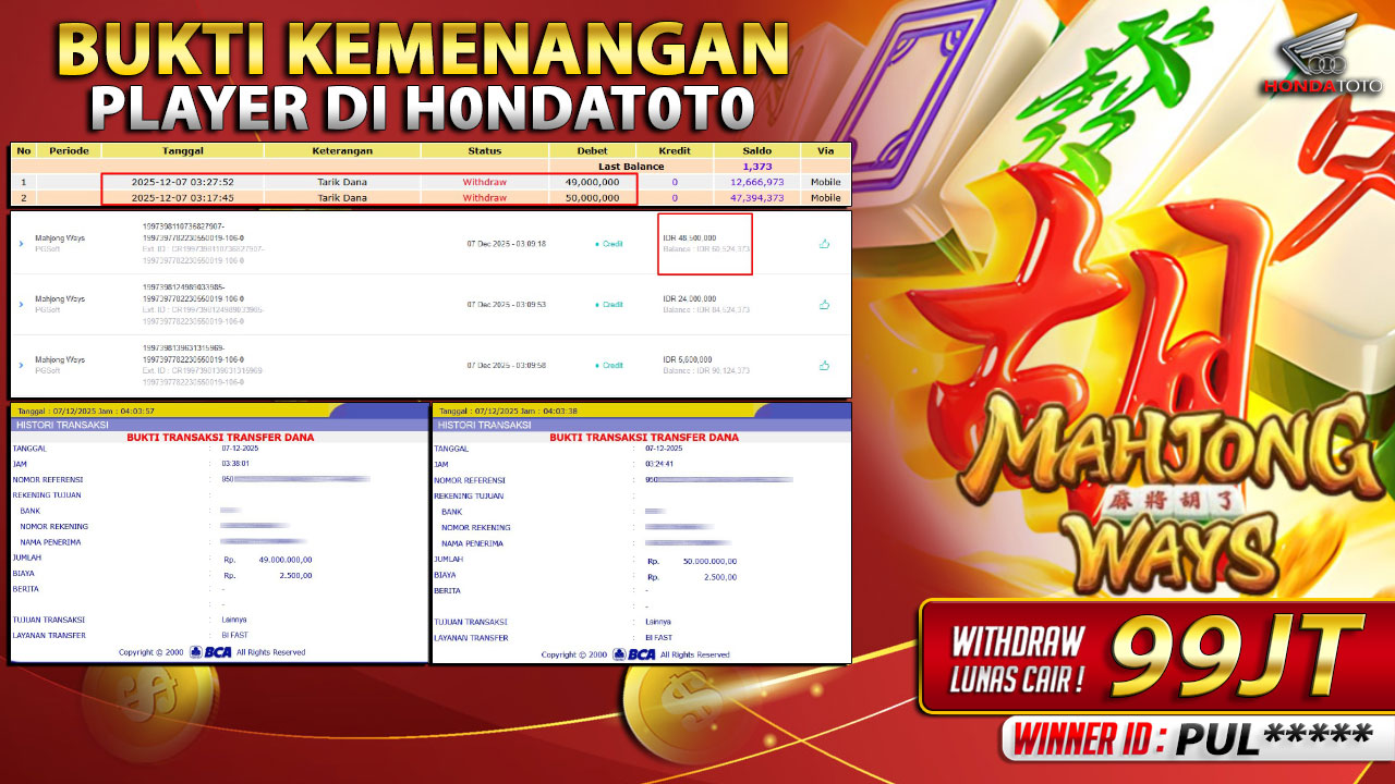 Bandar togel HONDATOTO merupakan bandar togel dan slot online yang membayar semua kemenangan member hingga lunas. Setiap pembayaran pada situs kami dilakukan dengan cara transfer ke rekening tujuan yang sudah di daftarkan pada situs togel online kami, Pembayaran hanya dapat di proses jika rekening yang di daftarkan telah valid dan dapat di transfer. Semua kemenangan member yang mendapatkan hadiah jackpot terbesar akan kami posting agar semua pemain dapat melihat bandar situs terpercaya HONDATOTO ini membayar semua kemenangan member hingga lunas. Setiap postingan yang kami posting akan kami lakukan sensor pada nomor rekening 4 digit dan nama rekening untuk menjaga privasi dan kerahasiaan member. Postingan Jackpot yang kami posting agar member atau pemain yang belum pernah bermain bisa melihat bandar togel Bukan Kaleng Kaleng Seperti HONDATOTO ini, Semua postingan jackpot yang kami posting dapat di lihat data keasliannya melalui nomor reff yang di tunjukan pada bank atau mbanking saat kita melakukan transfer.