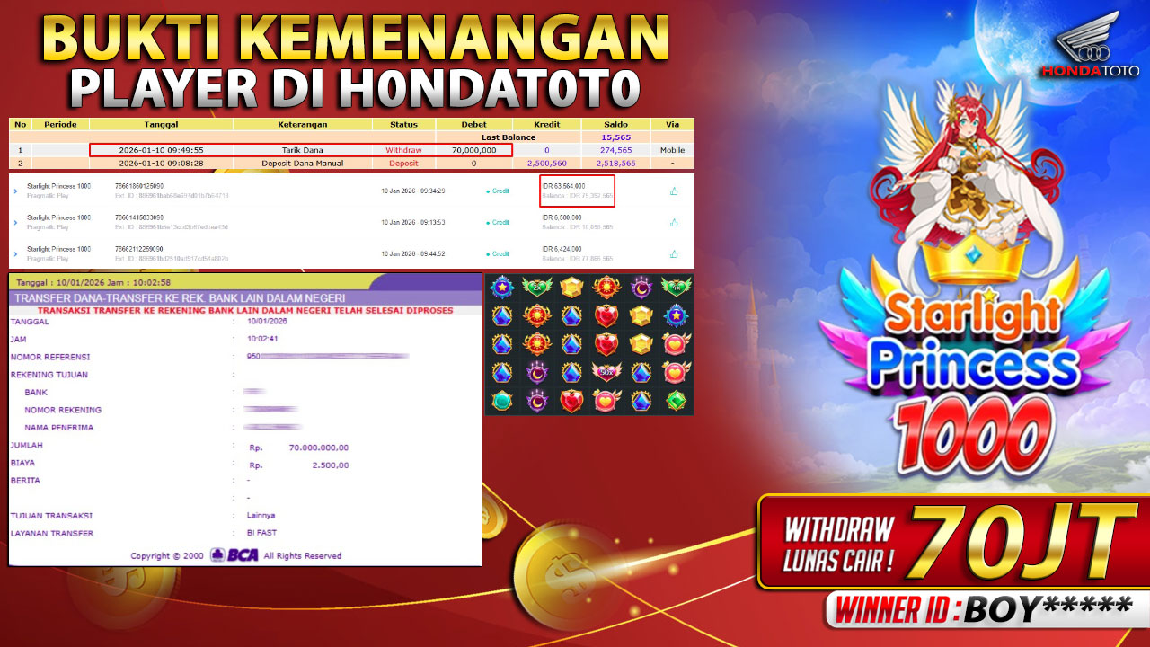 Bukti Kemenangan 10 JANUARI 2026 Di STARLIGHT PRINCESS 1000 WD 70 Juta